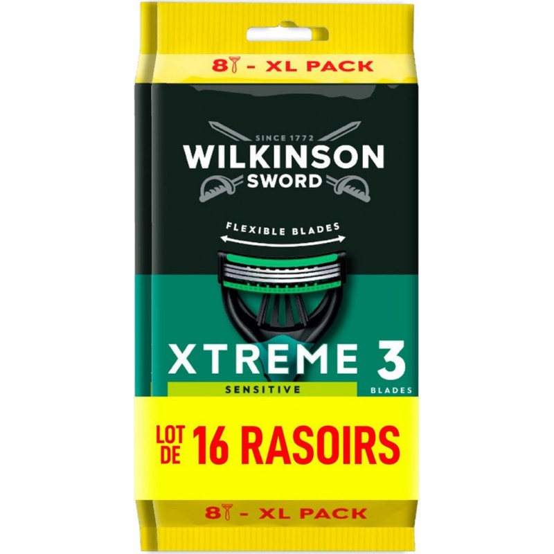 WILKINSON Rasoir Jetable Xtreme 3 Pour Homme Peau Sensible 3 Lames Flexibles lot de 2 paquets 8 rasoirs