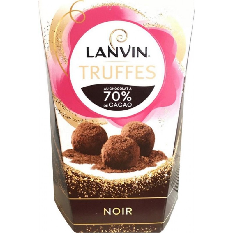 Les célèbres Truffes de Lanvin au bon chocolat Noir idéal à déguster pendant des fêtes en famille ou entre amis. Pâte de cacao, sucre, lait concentré sucré (lait, sucre), humectant (sorbitol), beurre de cacao, sirop de glucose, beurre pâtissier, lait entier en poudre, cacao, lactose, émulsifiant (lécithine de tournesol), petit-lait en poudre, stabilisant (invertase), arôme. 44% de chocolat noir à 70% de cacao. Produit unitaire EAN 8000300357561.